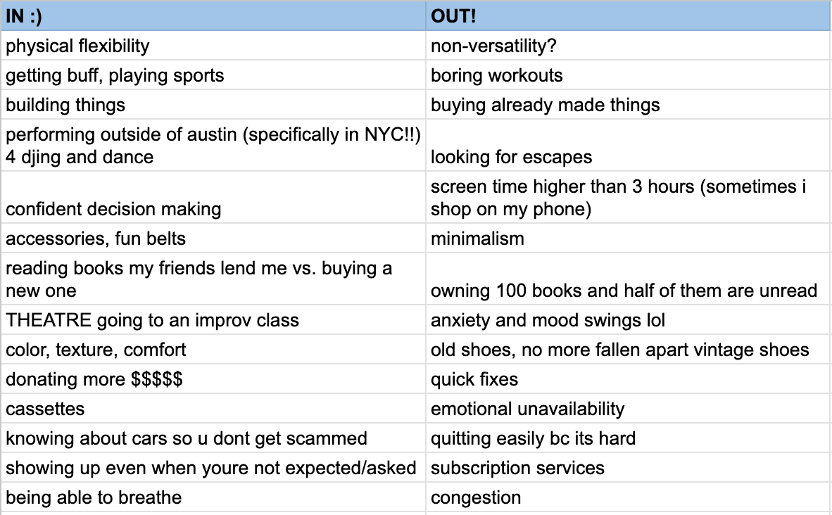 all this to say, i have an ins and outs list and yes i know youve all been waiting for it. some of it is silly, some of it are really real things that matter to me. and if you know someone who can book me to either DJ arabic records, or dance outside of austin pleaseeee email me 💋 do any of these speak to you? lmk